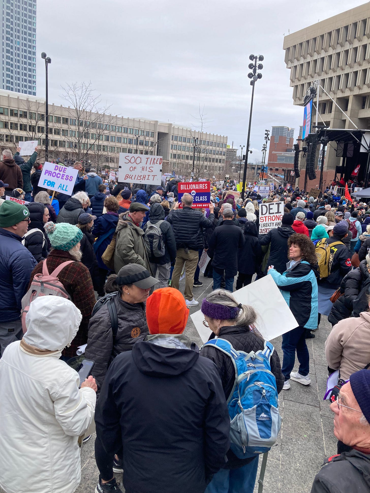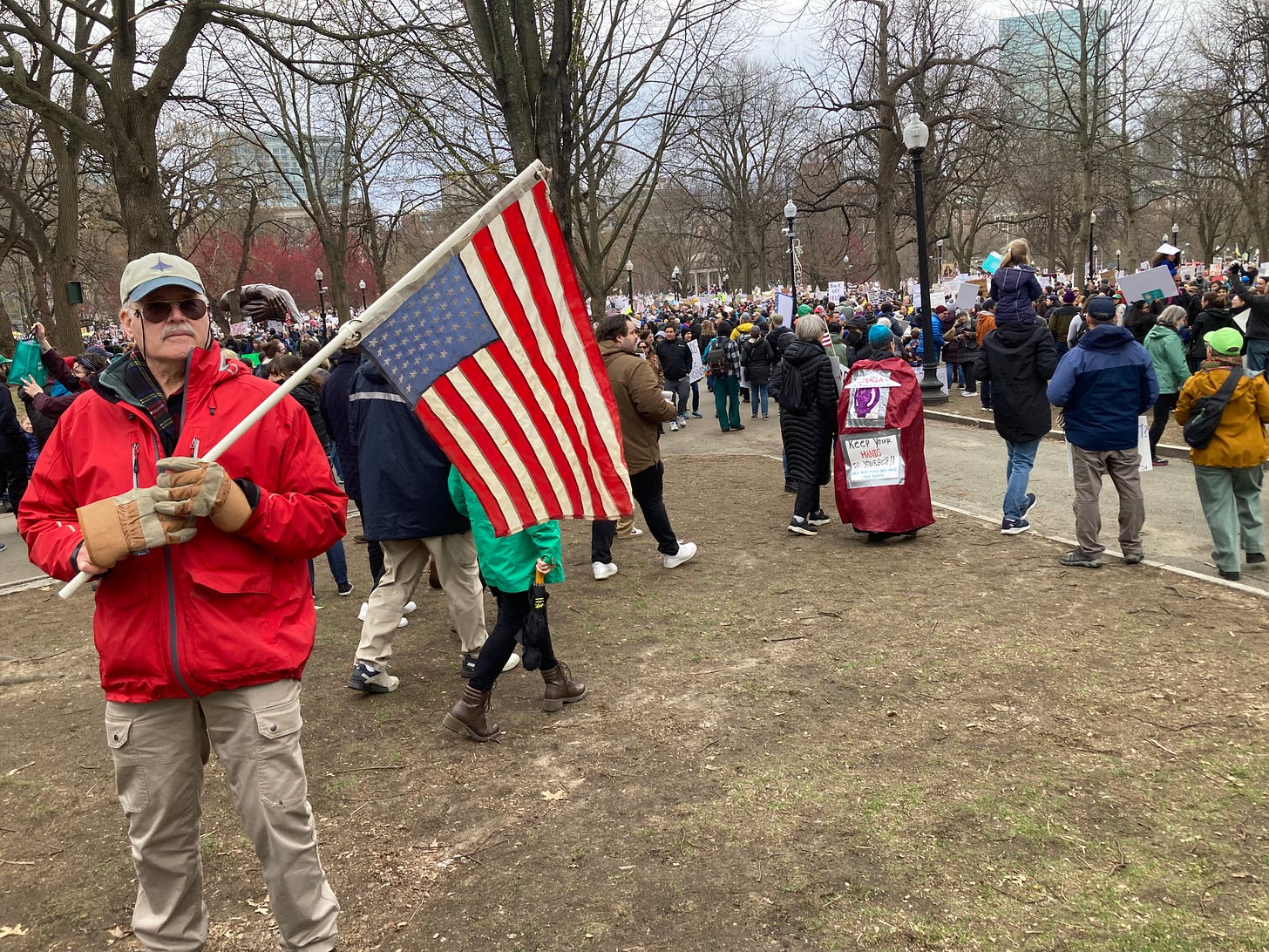 A few scenes from the Hands Off protest in Boston today. A friendly—though not to Trump—and enthusiastic crowd on a raw, chilly day with the promise of showers.